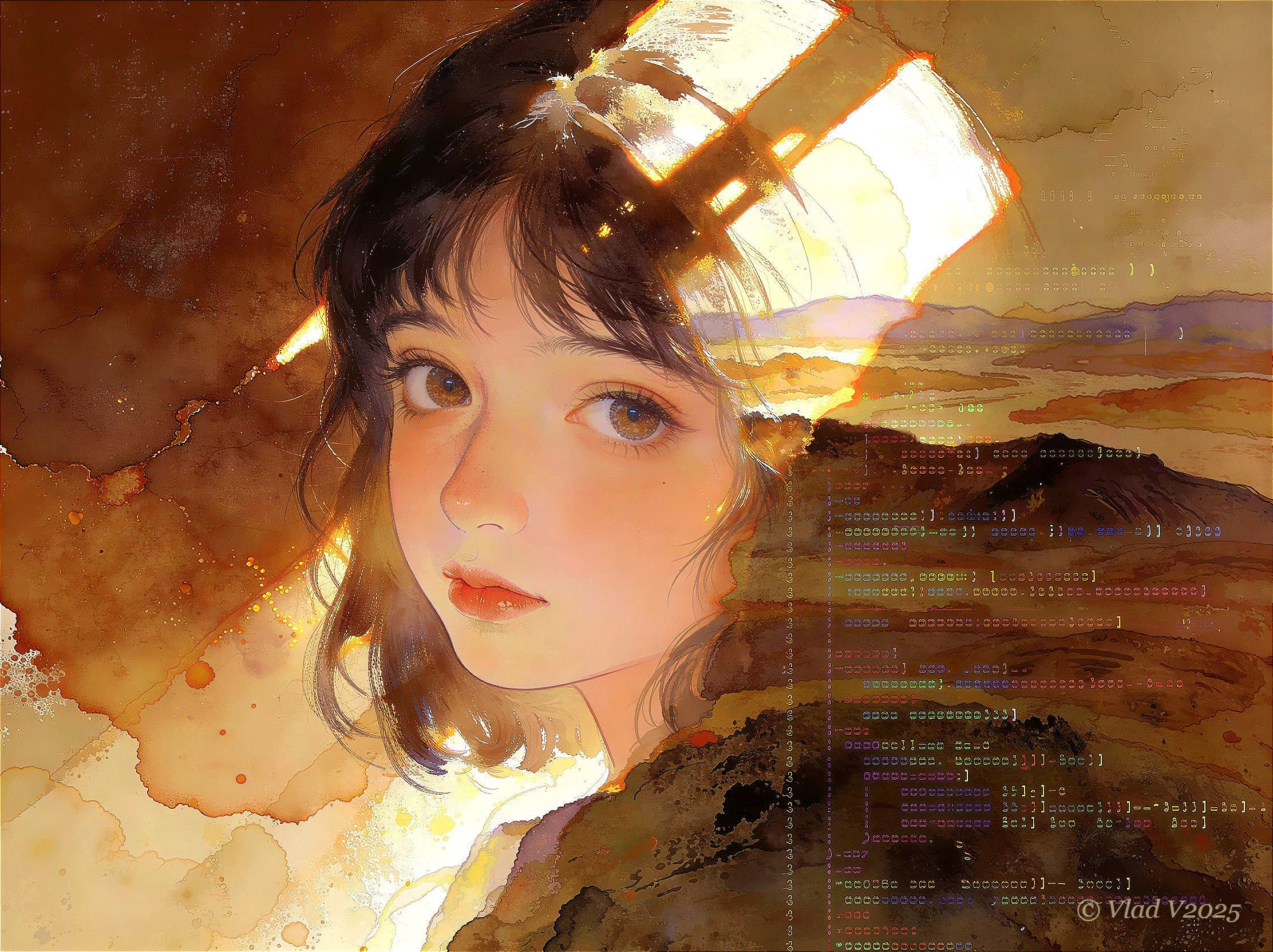 A watercolor painting with an anime style depicting a young woman with a long neck and short, dark hair, with a programming terminal overlaid on the right side of her face. Her face and hair are lit through a window, silhouetting her hair against the light. The background is a mix of brown