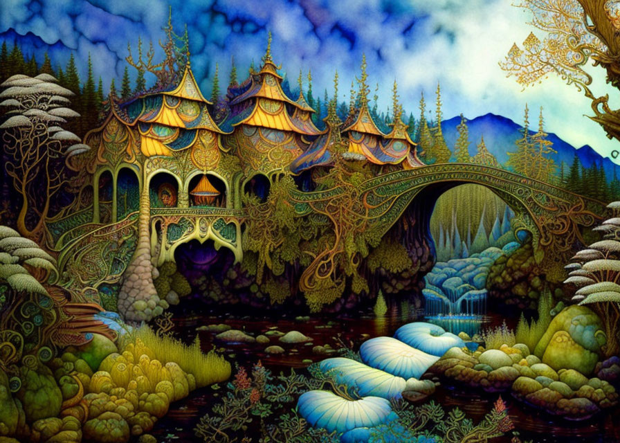 Elaborate fantasy landscape with golden-roofed palace and colorful vegetation