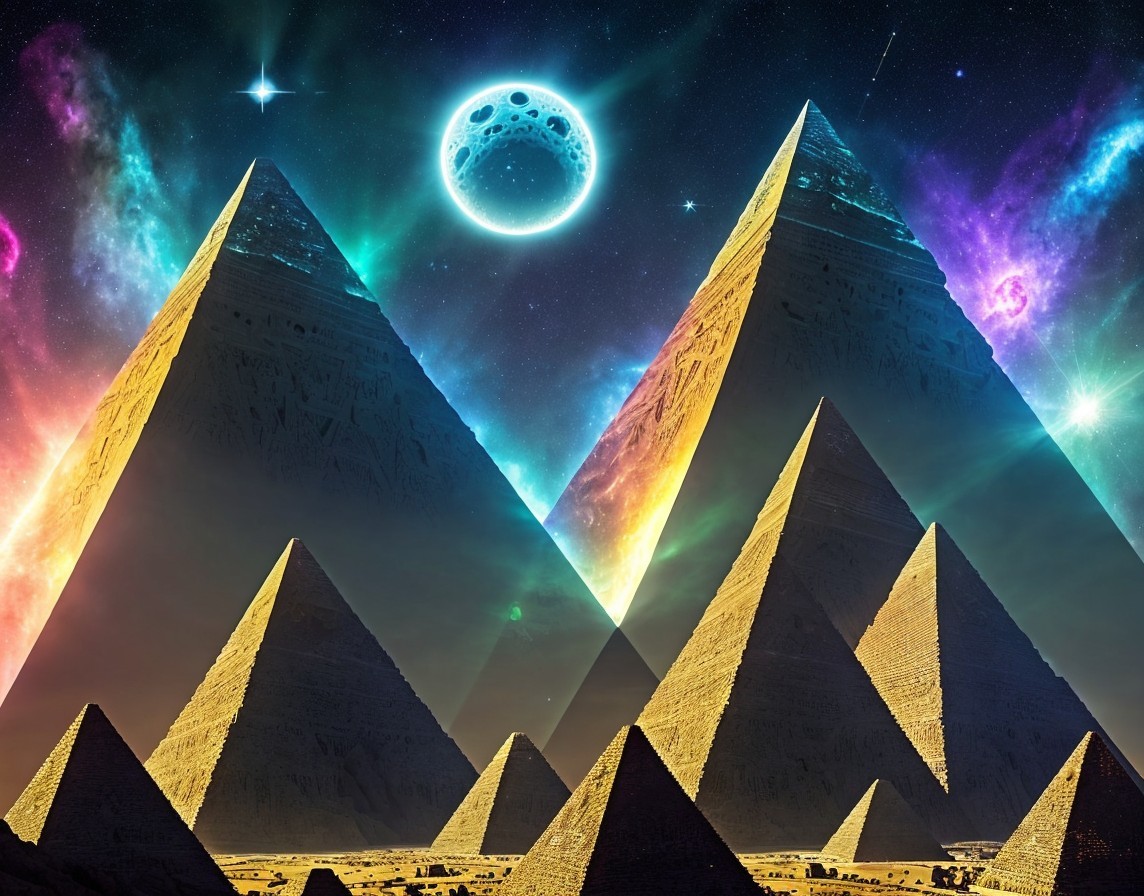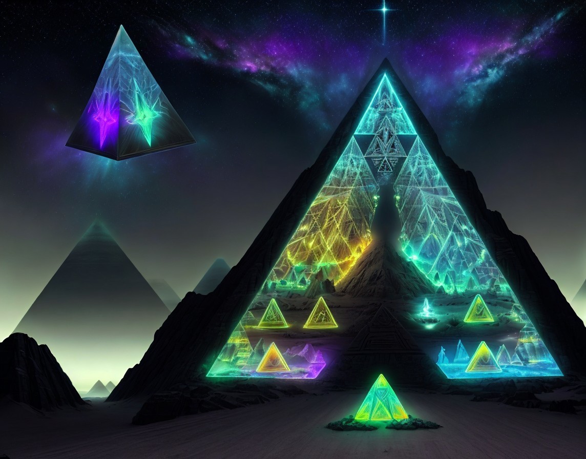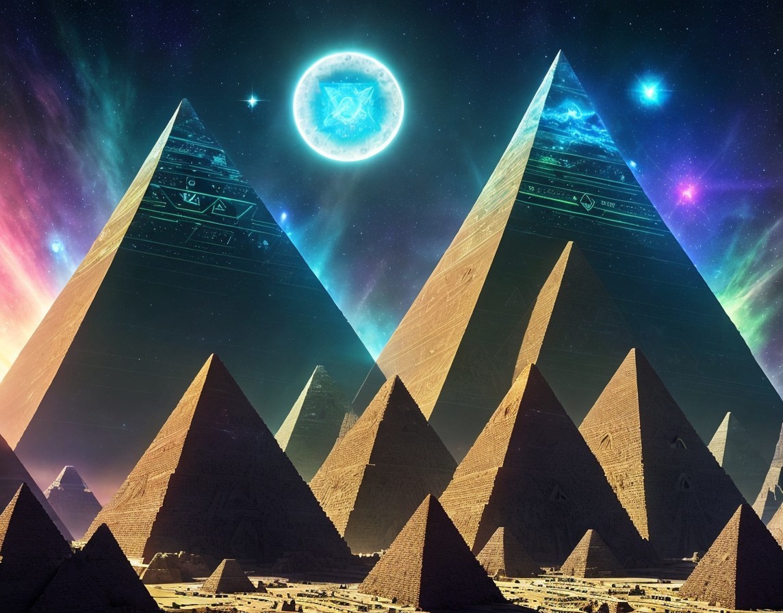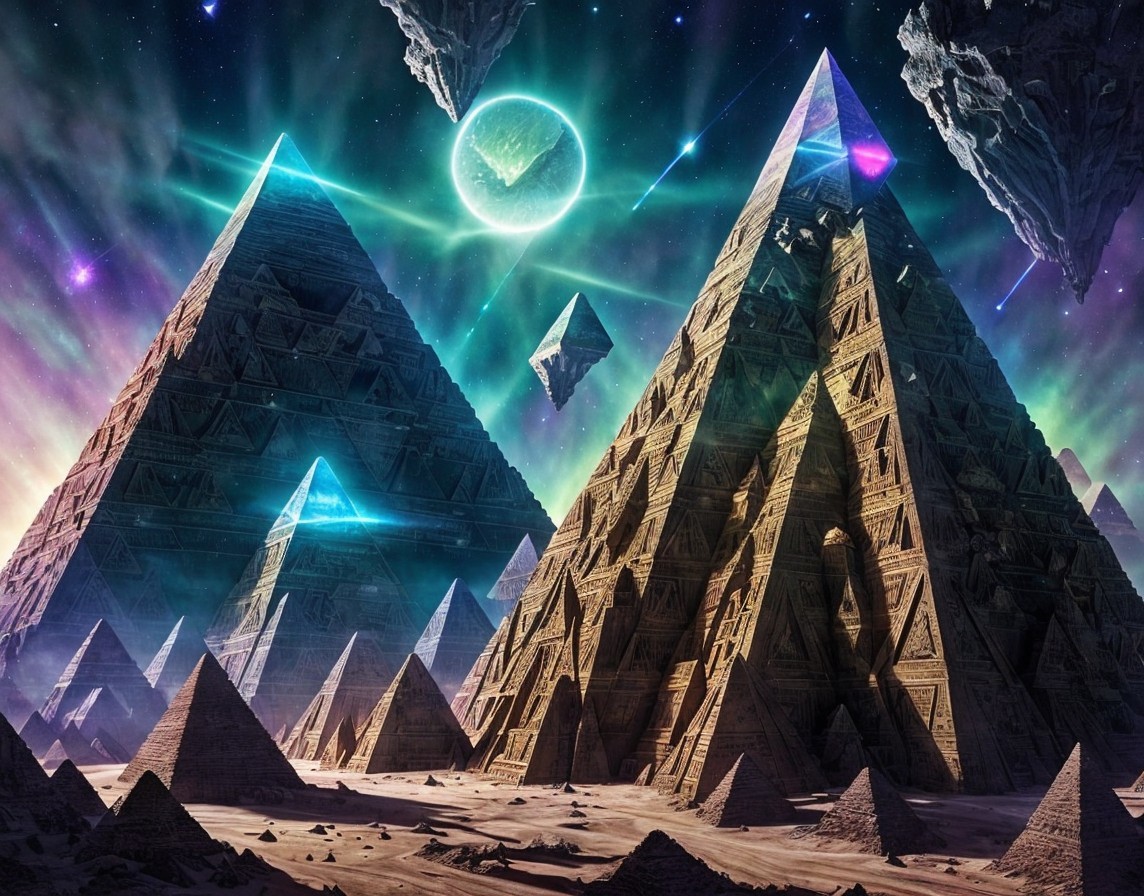 + Prompt:High-tech extraterrestrial pyramid assimilated with arcane sacred geometric patterns and advanced alien technology. The sun, moon, and planets amongst the "pillars of creation" nebula in the sky. glowing phosphorescent crystalline mineral deposits, mineral crystals, geode crystals, geometric patterns, honeycomb patterns. pyramid with runes and colossal mineral crystals. Ultra Realistic landscape under a complex cosmic sky. Enigmatic astral projection/alien contact, galactic LSD art, surreal hallucinogenic vibes, sci-fi LSD art. In the style of Cameron Gray