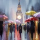 A vibrant, impressionistic painting depicts a rainy street scene with the iconic Big Ben clock tower in the background, its face illuminated by a golden glow. The sky above is a blend of pale blues and hints of pink and yellow, with vertical streaks suggesting falling rain. Below, the street is alive with