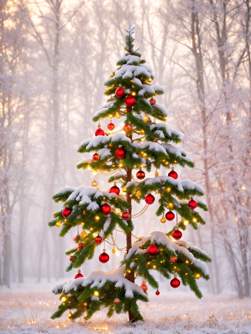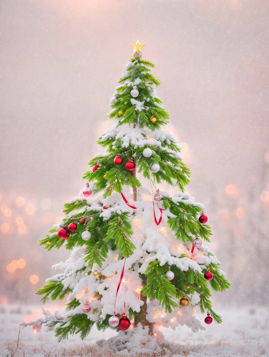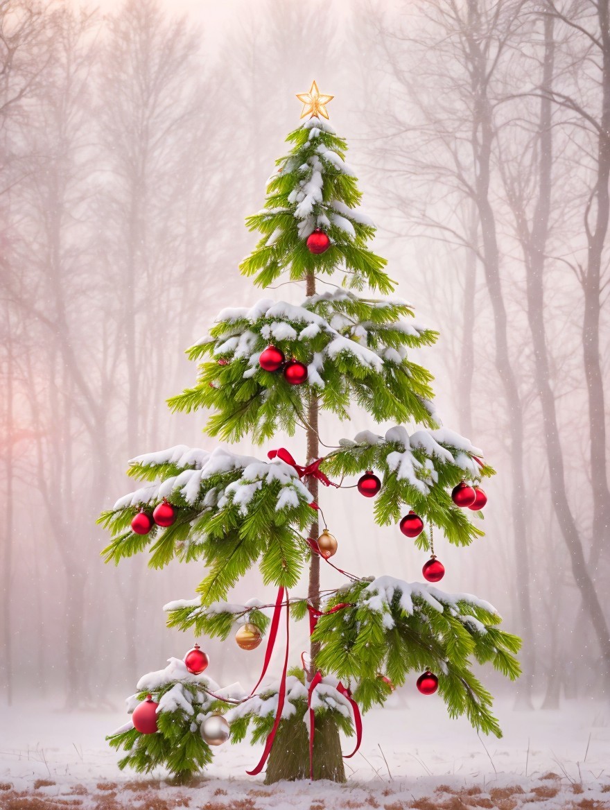 Prompt: A dreamy Christmas tree adorned in shiny red, silver and gold ornaments and tinsel in the foggy haze of an open cornfield that has been freshly plowed and harvested!