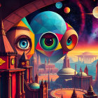 A whimsical landscape features a vibrant eye in the foreground, with colorful hot air balloons floating above a fairytale-like castle set against a starry sky and rolling hills.
