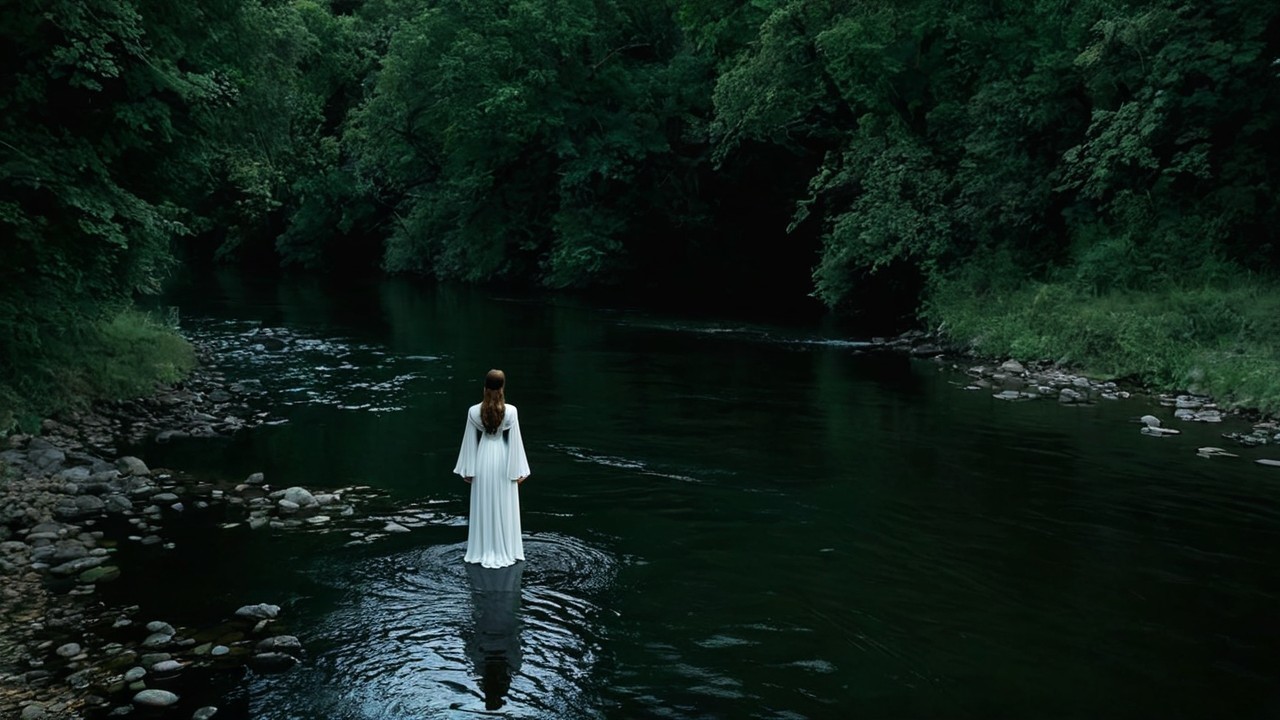 (Try from Stanislav Kozenko) - A figure in a flowing white gown stands in still water surrounded by lush greenery. The serene atmosphere evokes a sense of mystery and calm, reflecting the beauty of nature.