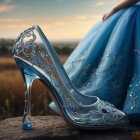Elegant high-heeled shoes in shades of blue, adorned with intricate gold designs. The translucent material and delicate detailing create a whimsical, fairy-tale vibe. Perfect for a magical occasion.