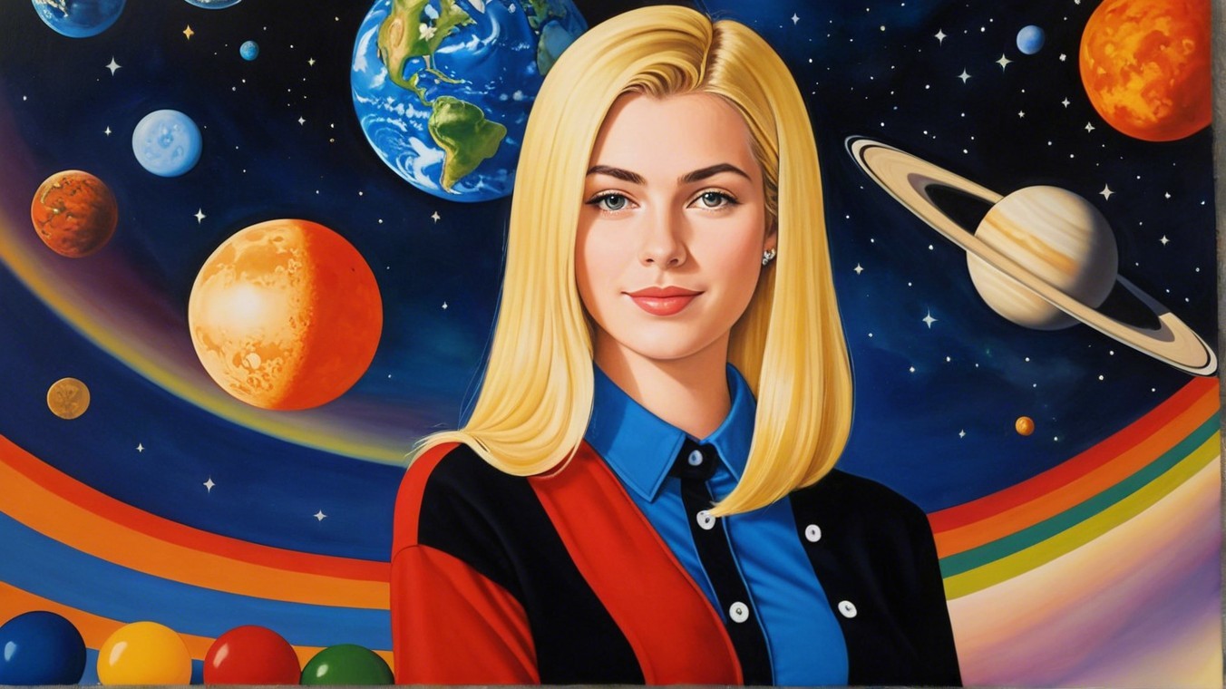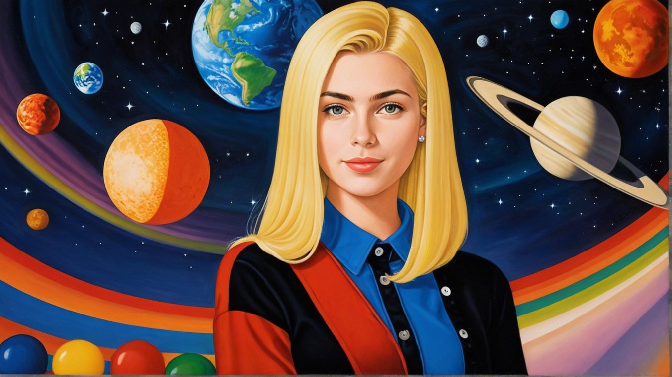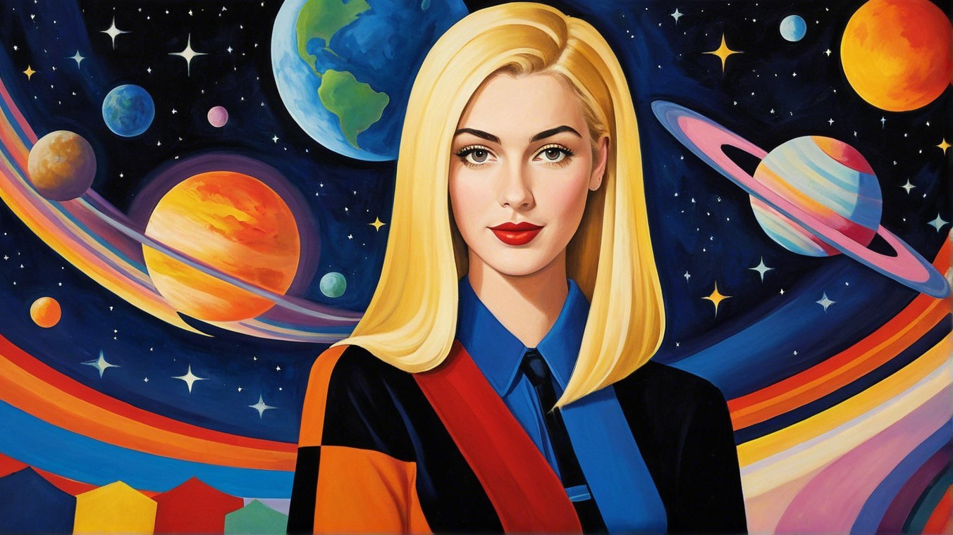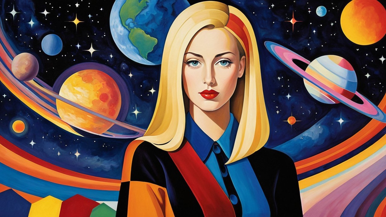 Prompt: "In the style of Wassily Kandinsky and Tamara de Lempicka is the meaning of life the universe and everything really 42 as it says in the Hitchhikers guide to the galaxy or something else?) Art in the style of Amelie Elmquist who is blonde and 17 to 25 years of age this artwork is under her pseudonym Amelea as in her album Channel 9 she also uses the pseudonym Amelea Elmstreet in the distance is a brick dollhouse"