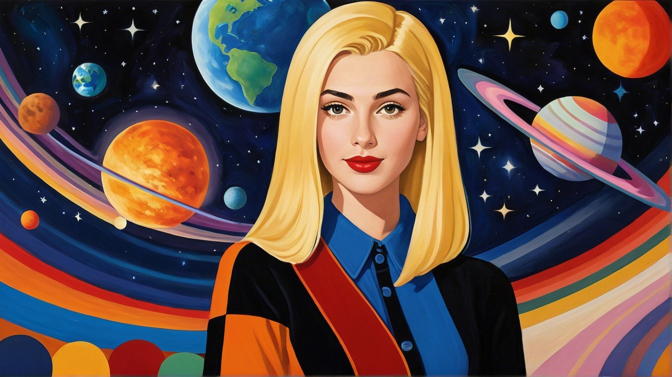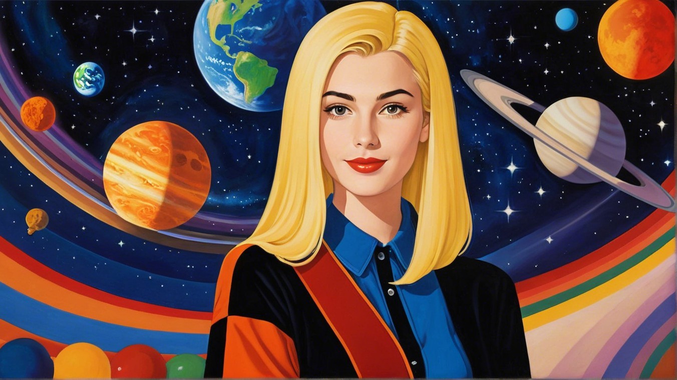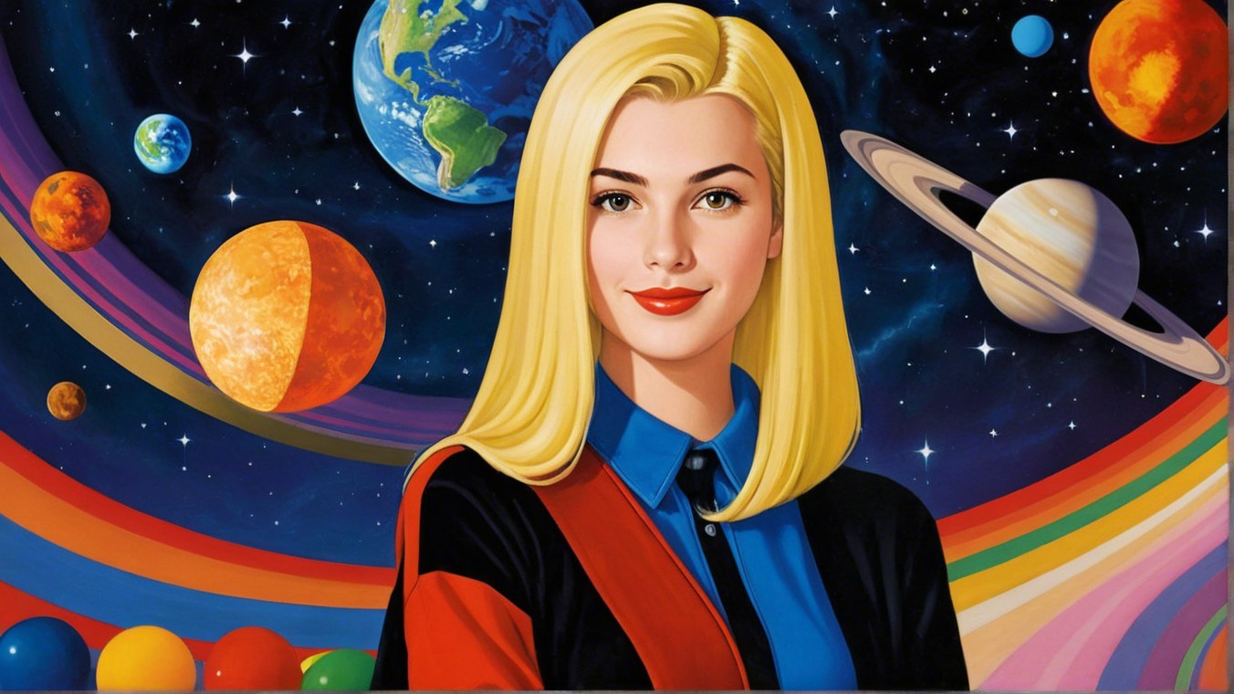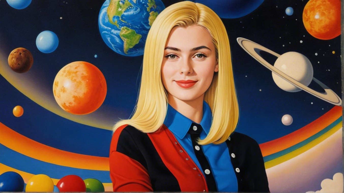 Prompt: "In the style of Wassily Kandinsky and Tamara de Lempicka is the meaning of life the universe and everything really 42 as it says in the Hitchhikers guide to the galaxy or something else?) Art in the style of Amelie Elmquist who is blonde and 17 to 25 years of age this artwork is under her pseudonym Amelea as in her album Channel 9 she also uses the pseudonym Amelea Elmstreet in the distance is a brick dollhouse"