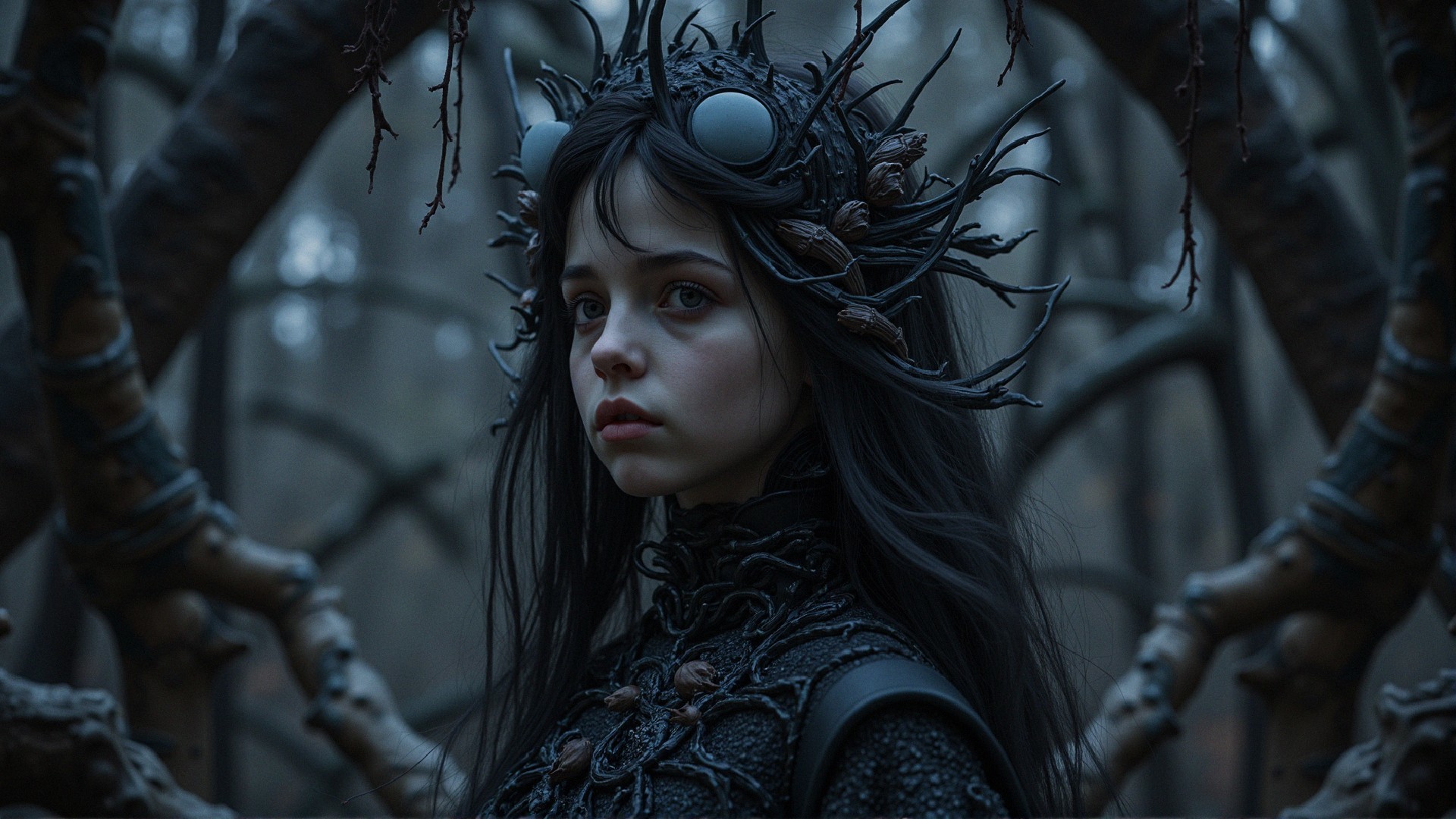 A young woman stands amidst a mystical forest, adorned with intricate black foliage and a striking headpiece. Her long, dark hair flows elegantly, complementing the enchanting, shadowy surroundings.