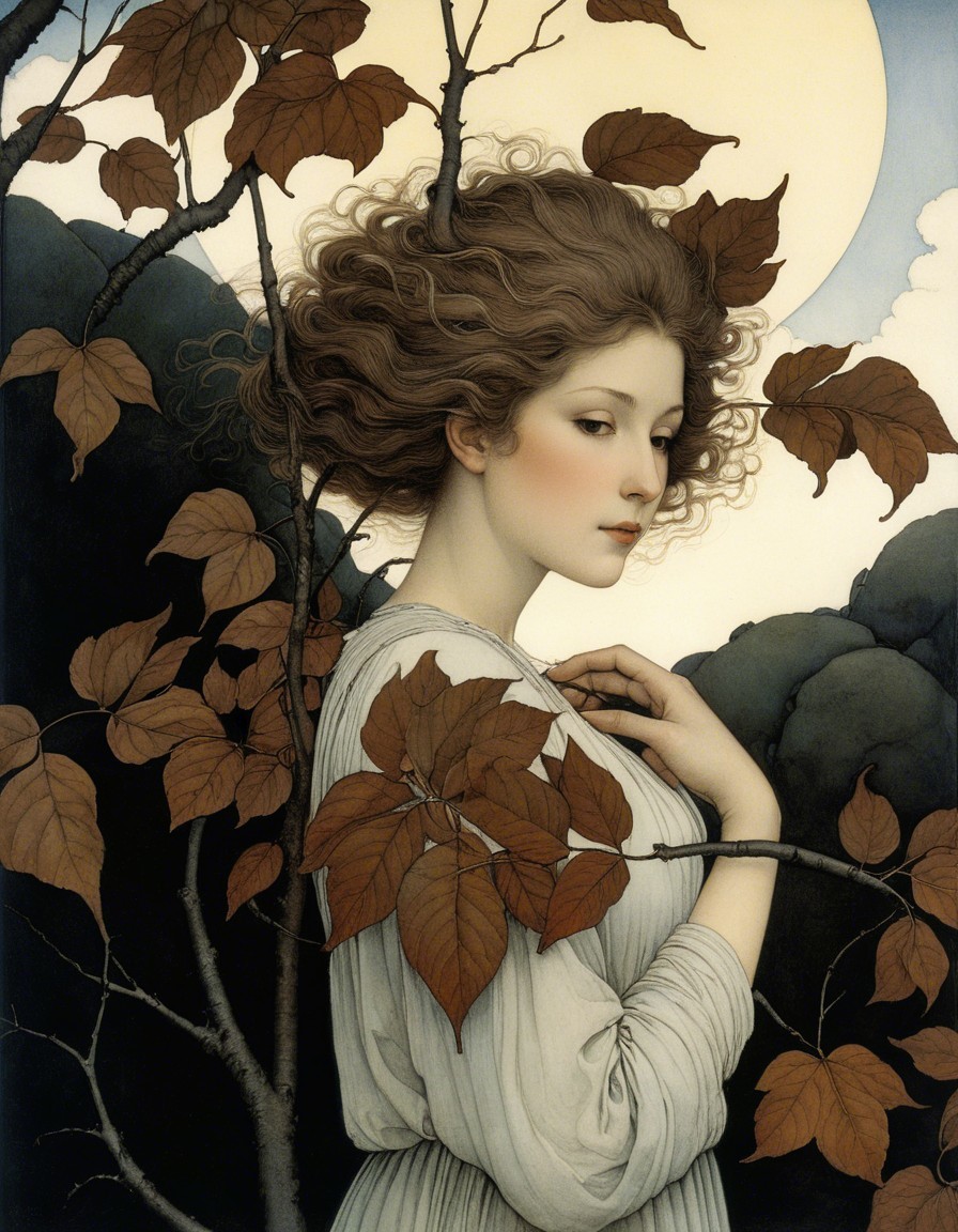 A serene woman with long, flowing hair gazes thoughtfully from within a tree. Autumn leaves surround her, enhancing the ethereal atmosphere of the scene. The colors are soft and muted.