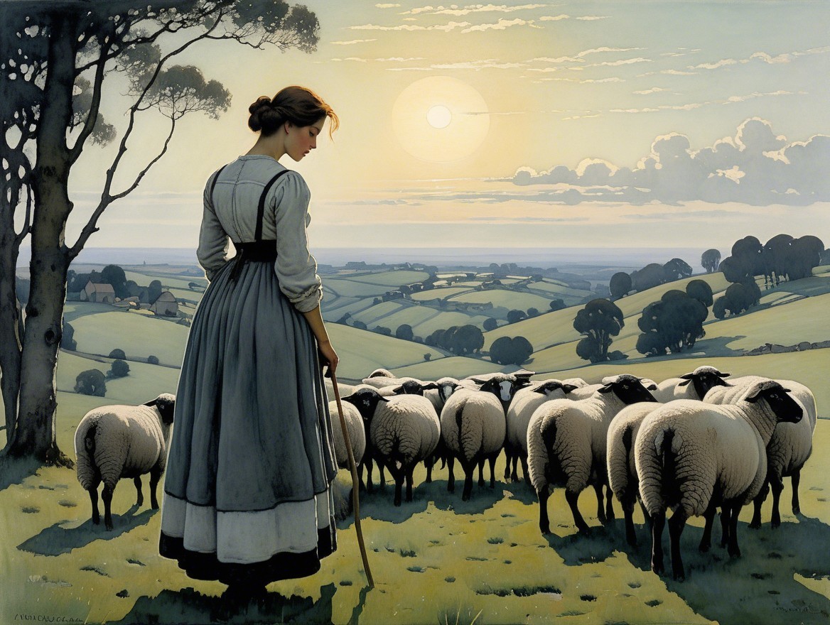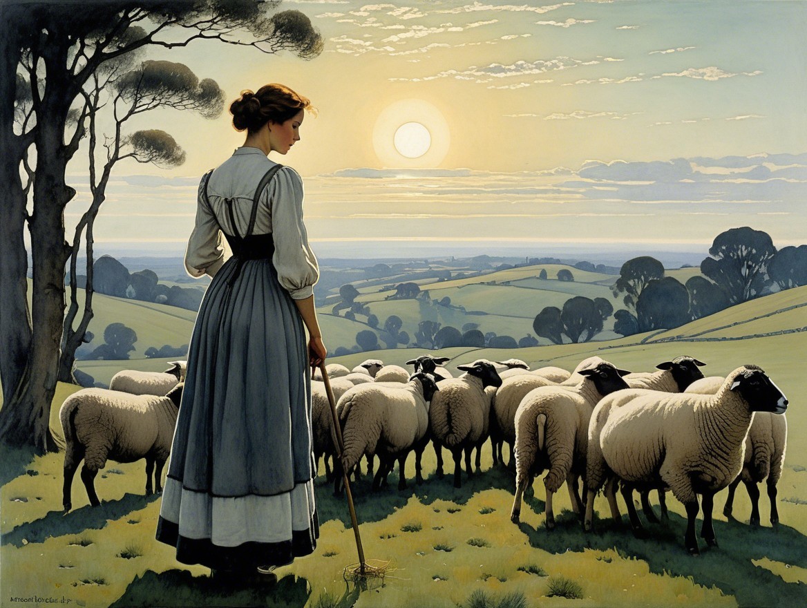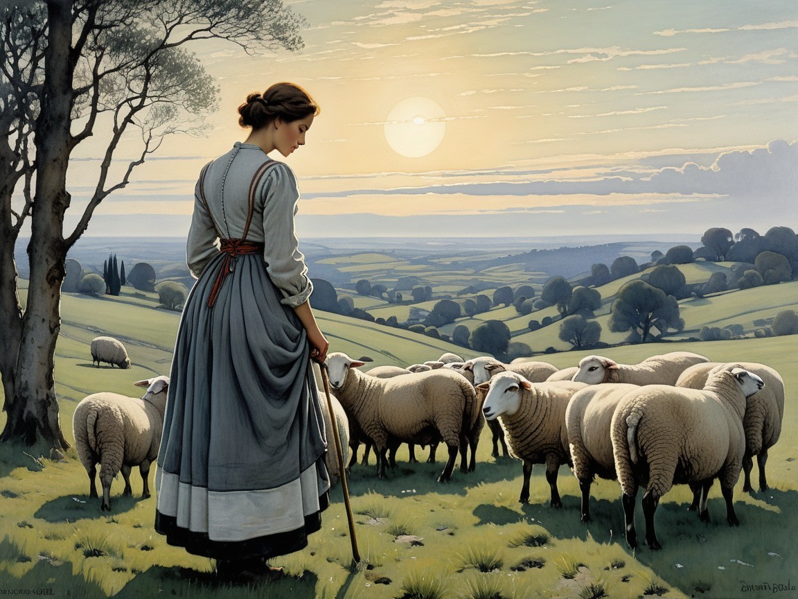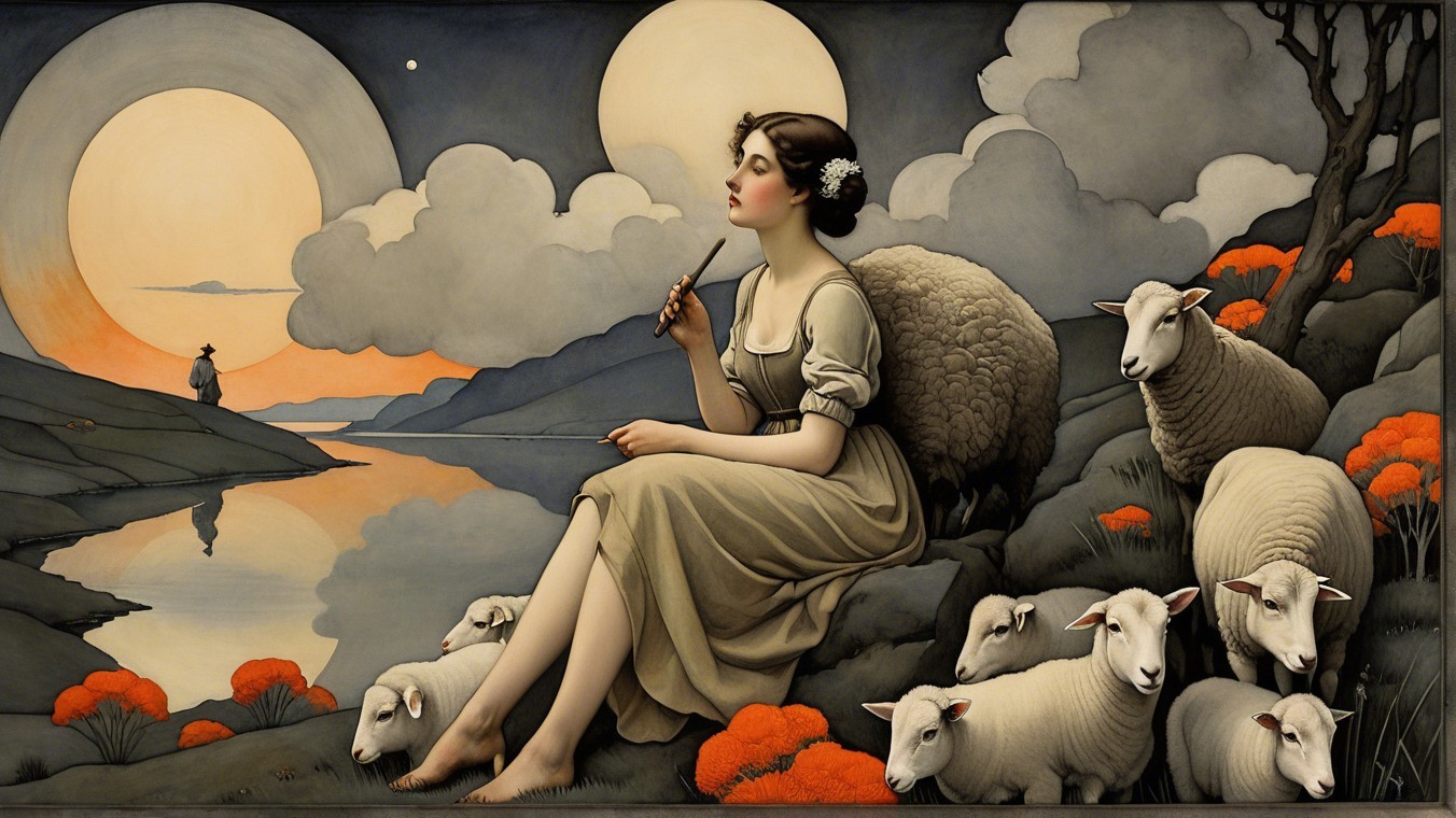 A serene pastoral scene features a shepherdess in traditional attire, surrounded by sheep. Two large moons illuminate a tranquil landscape of hills and a reflective lake at twilight.