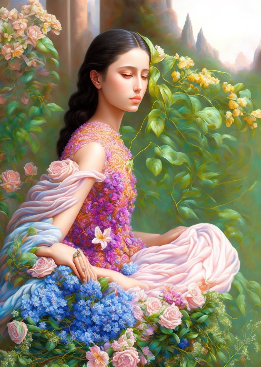 Vivid painting of a woman and man in lush greenery with blooming roses