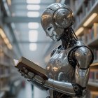 A futuristic robot, with a sleek design, reads a book in a vibrant library filled with swirling patterns and colorful bookshelves, blending technology and knowledge in a captivating scene.