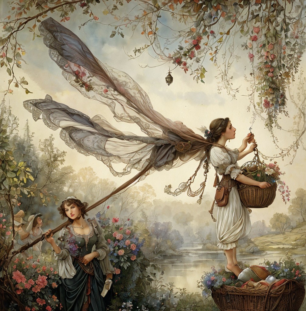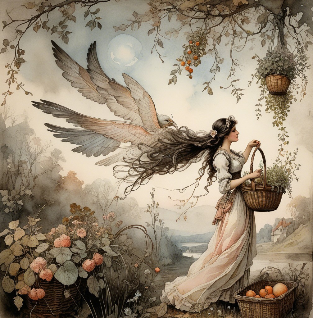 . Gypsy lady collecting herbs in basket , colored ink drawing, watercolor artwork on old withered paper, vintage, by Caravaggio, Fragonard, Anton Pieck, pale colors, high detail, intricately detailed, hyperdetailed volumetric lighting, art nouveau graphic steampunk ., whimsical, beautiful, poignant, touching. colors blush bronze, black. soft watercolor extra water in magical realism by Annigoni, Egon Schiele, Milo Manara, Botticelli, Catrin Welz-Stein, Jean Metzinger, Klimt, perfect eyes, perfect handsface, highly detailed, complementary colors, hyper detailed. Watercolor and ink splatter, dynamic pose, dark blue background, unreal engine, alphonse mucha, global illumination, detailed and intricate environment Beautiful woman in the style of Pino Daeni Dorota Piotrowiak Edward Gorey, junji ito, klimnt , gold leaf color, silver leaf color beautiful dynamic lighting high definition hdr * Random prompt award winning Max Ernst ultra detailed 4K 3D Texture