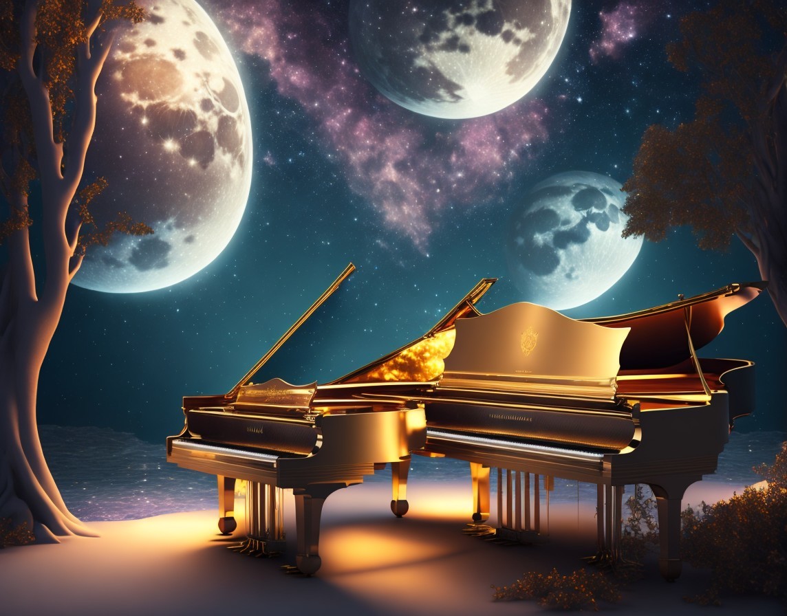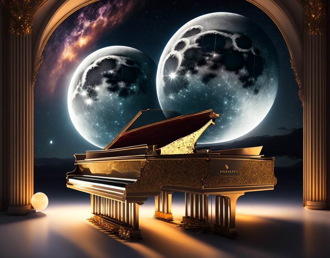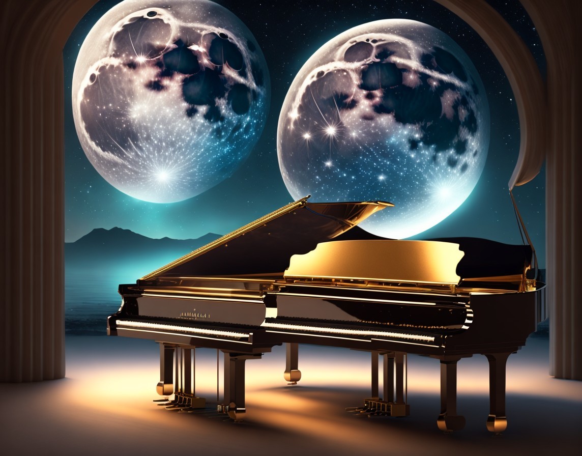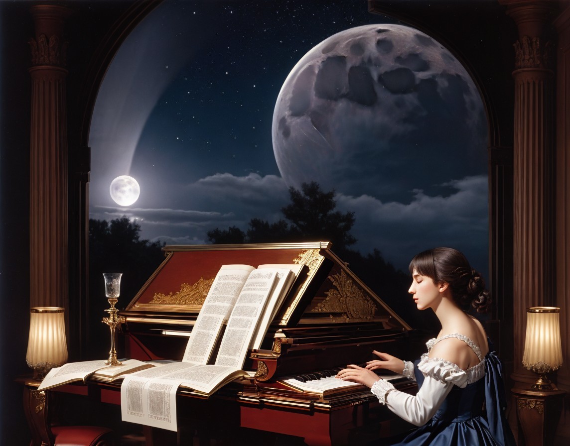 A woman plays a grand piano by a large window at night, with a full moon and stars in the sky.