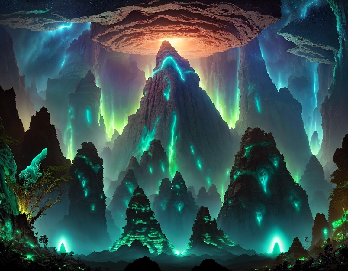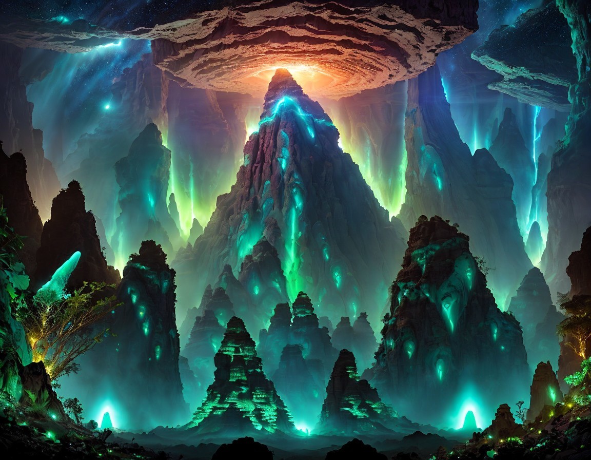 + Prompt:Extraterrestrial pyramid, bioluminescent menagerie seamlessly intertwined with advanced alien technology in a blend of Amazon Rainforest and Martian canyons under a dynamic sky with massive clouds of nebula emitting an ethereal glow like the "pillars of creation". Extraterrestrial jungle glows with bioluminescent organisms while alien canyons carve through the mountainous terrain of swirling dust storms, large boulders with mysterious runes and sacred geometric patterns. Pyramid surrounded by colossal crystals. UFO in front of hypnotic bioluminescent mushrooms and colossal crystals. sacred geometry, mystical.Realistic and natural elements. In the style of Cameron Gray