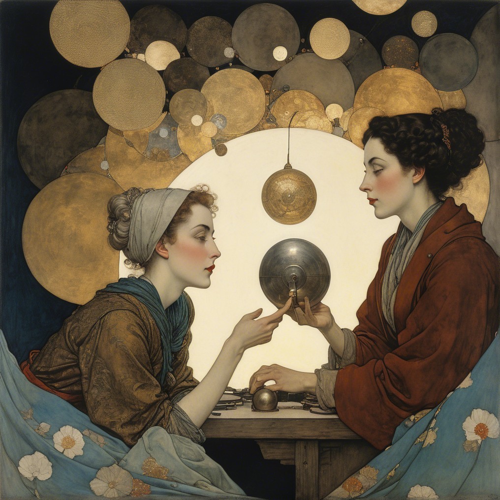 The artwork features two women in a circular, abstract setting. One holds a circular object, while both share an intimate gaze, blending elegance with a hint of mystique.