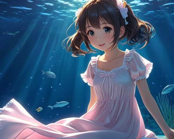 A whimsical scene unfolds in an underwater house designed for a mermaid, featuring a girl in a strapless swimsuit. Colorful coral and aquatic life surround the enchanting abode, creating a serene atmosphere.