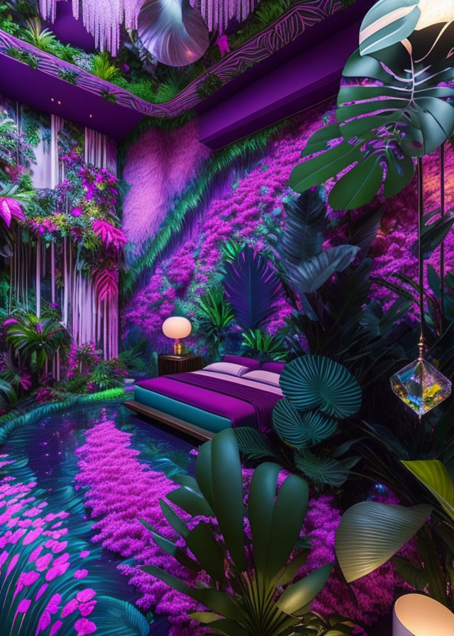 + Prompt:A beautiful bright bedroom. Entire walls are painted to depict deep vibrant green jungle and river flowing, so realistic that the room drowns in the jungle. A minimalist room with a large bed and plenty of lush pillows, an armchair and a tall lamp next to the bed and a gorgeous crystal chandelier hanging from the ceiling. Lots of indoor plants. Vivid watercolours, 8k, intricate.