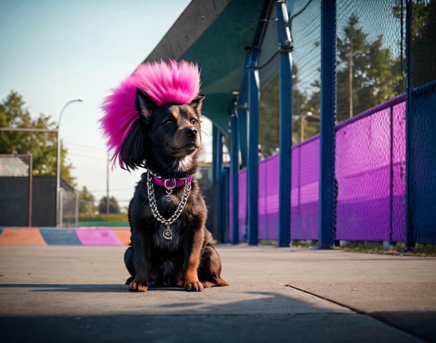 Vibrant pink mohawk dog with studded collar on pavement with colorful graffiti wall