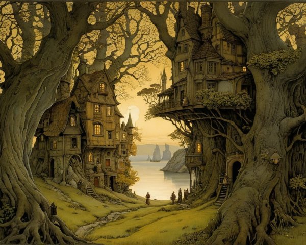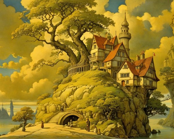 A dramatic scene depicts a majestic castle atop a cliff, surrounded by towering waves. Below, ships navigate the turbulent sea, creating a surreal contrast between land and water.