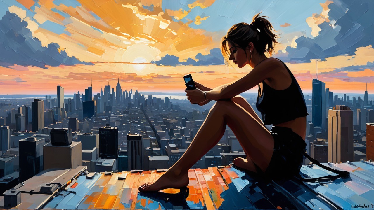 A young woman sits on a rooftop at sunset, gazing at her phone. The vibrant sky and city skyline create a stunning backdrop, capturing a moment of reflection and solitude in urban life.