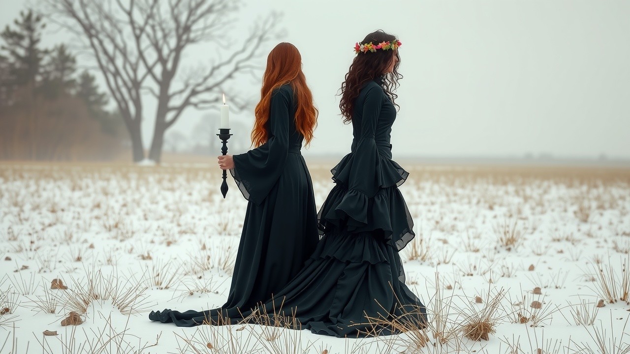The right figure has a more textured hairstyle, with dark, curly hair adorned by a delicate floral crown, lending an ethereal touch to her appearance. Her gown is intricately layered with ruffles, also black, adding depth and movement. She, too, holds a candlestick, suggesting companionship and shared intention.