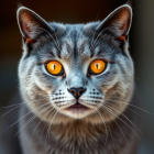 A sleek gray cat with striking orange eyes looks intently at the camera. It wears a blue collar adorned with a small bell, adding a touch of charm to its elegant demeanor.