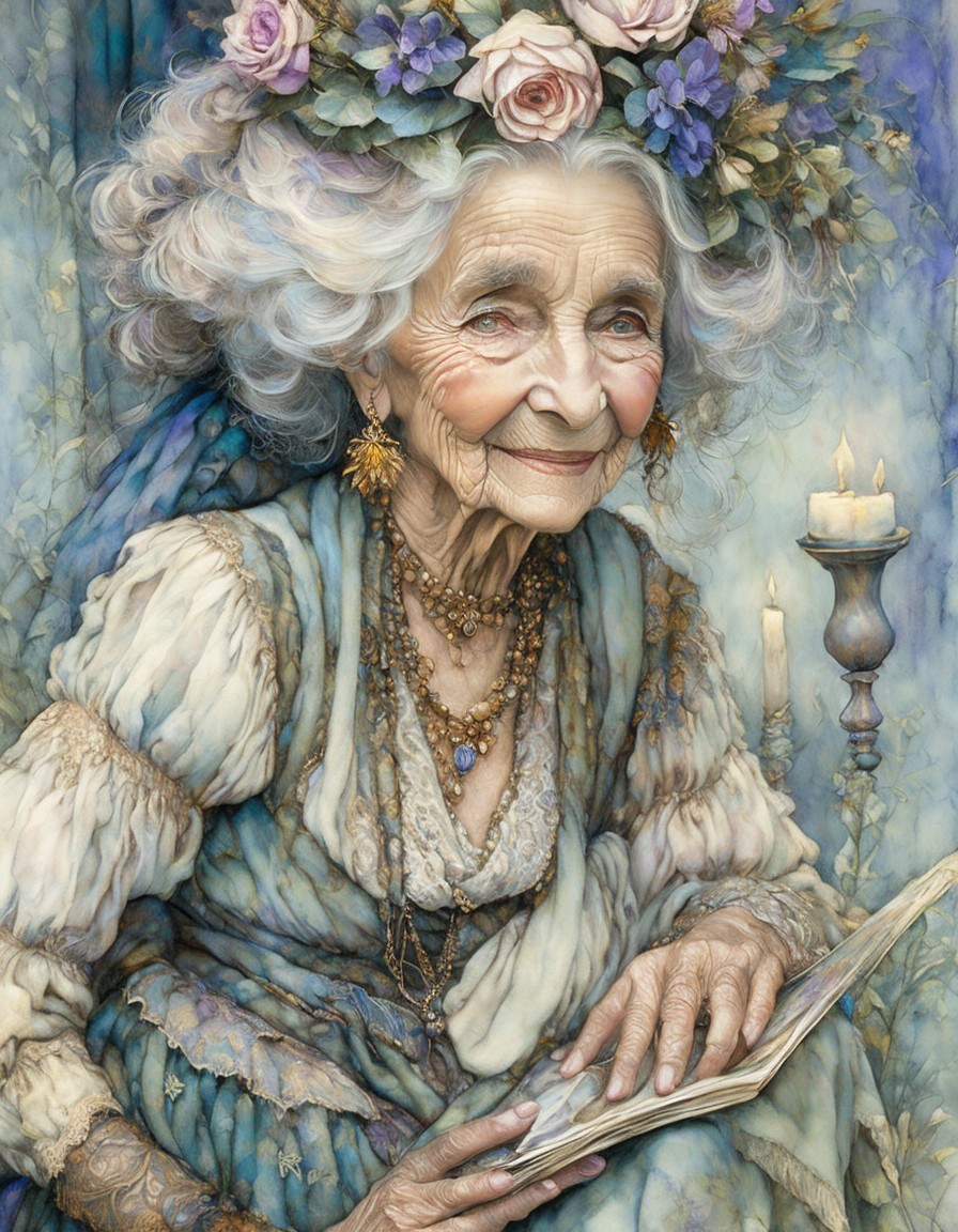 A gentle elderly woman with gray hair adorned with colorful flowers wears a soft, vintage outfit. She sits outdoors, exuding warmth and kindness, surrounded by a serene natural landscape.