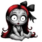 A cartoonish character with vivid red hair and exaggerated features sits in a dark tunnel, holding a creepy, doll-like figure. The scene blends whimsy with a touch of eerie charm.