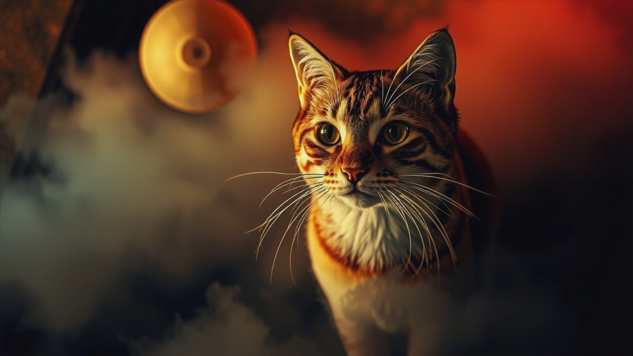 A striking cat with vivid orange and black stripes gazes intently in a dreamy landscape, shrouded in swirling clouds, illuminated by a large, glowing moon in the background.