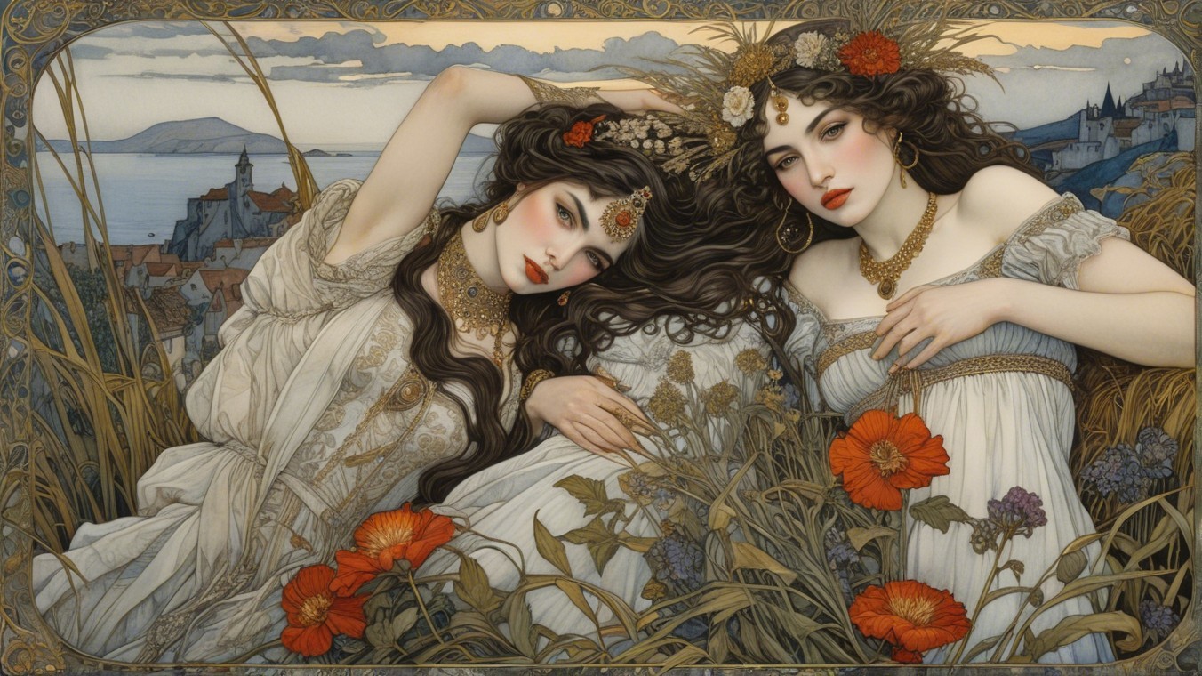 The image features two ethereal women adorned in flowing, ornate dresses, surrounded by lush fields and vibrant poppies. They wear floral crowns, exuding a sense of serenity and harmony with nature.