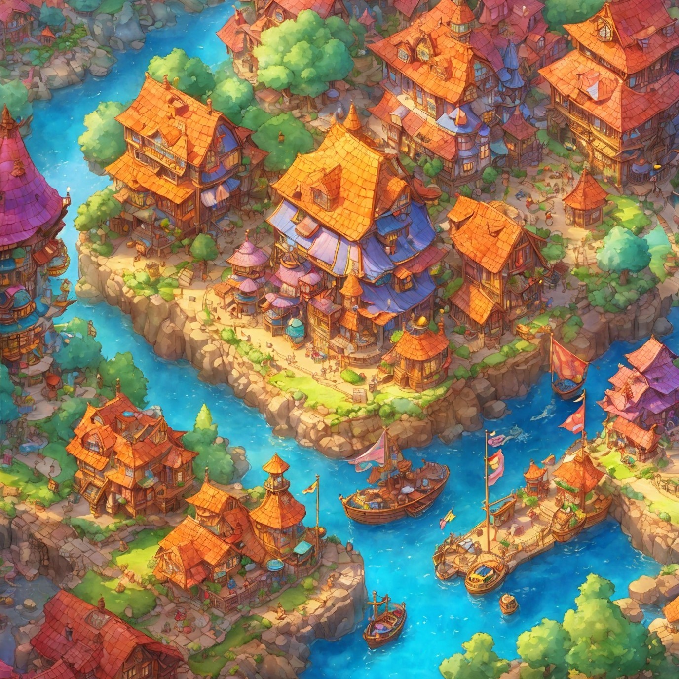 + Prompt:a cartoon town with a river and a boat in the middle of it, surrounded by trees and buildings, global illumination, fantasy art, anime artwork cute, funny, centered, award winning watercolor pen illustration, detailed, Disney, isometric illustration, drawing, by Stephen Hillenburg, Matt Groening, Albert Uderzo, Cute and adorable cartoon, fantasy, dreamlike, surrealism, super cute, trending on artstation. anime style, key visual, vibrant, studio anime, highly detailed, jetty, chimney, town, colorful, day, fantasy, grass, multiple boys, multiple girls, outdoors, river, rooftop, tree, water, watercraft