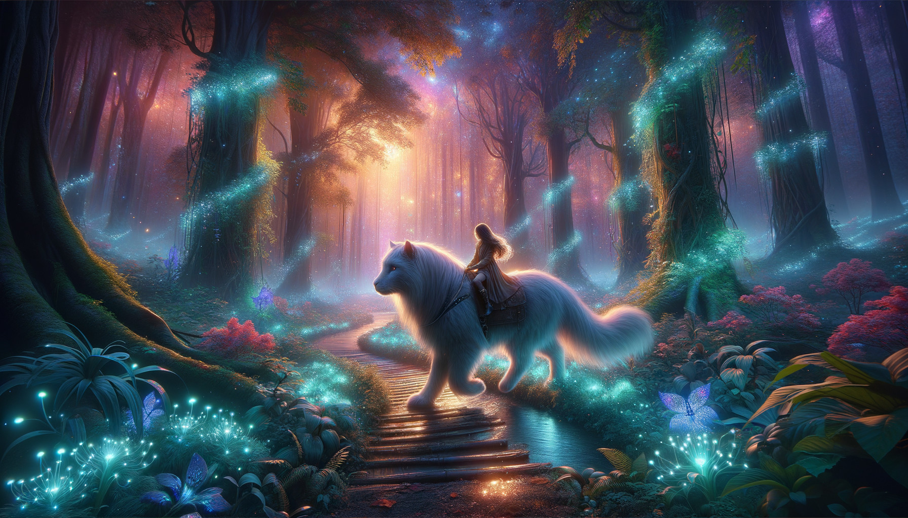 A mystical forest with a glowing path, featuring a person riding a majestic, large white wolf amidst vibrant, ethereal lights.