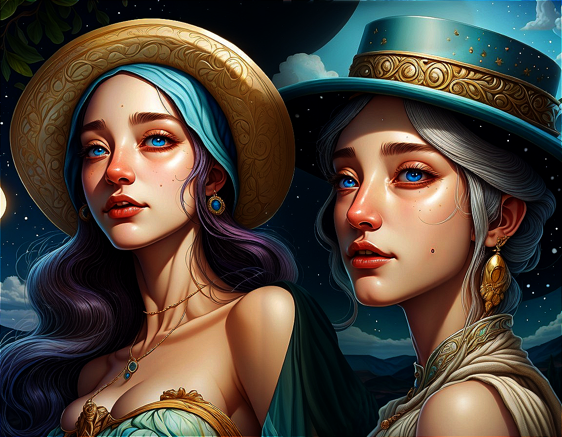 Two illustrated women with striking blue eyes and detailed fantasy attire, adorned with hats and jewelry under a dramatic sky.