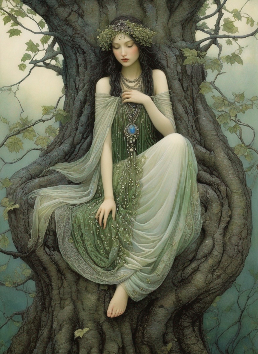 + Prompt:Morea is the name of another female dryad that lives on mulberry trees. Dryad priestess in flowing shawls, by Nicoletta Ceccoli, by Kay Nielsen