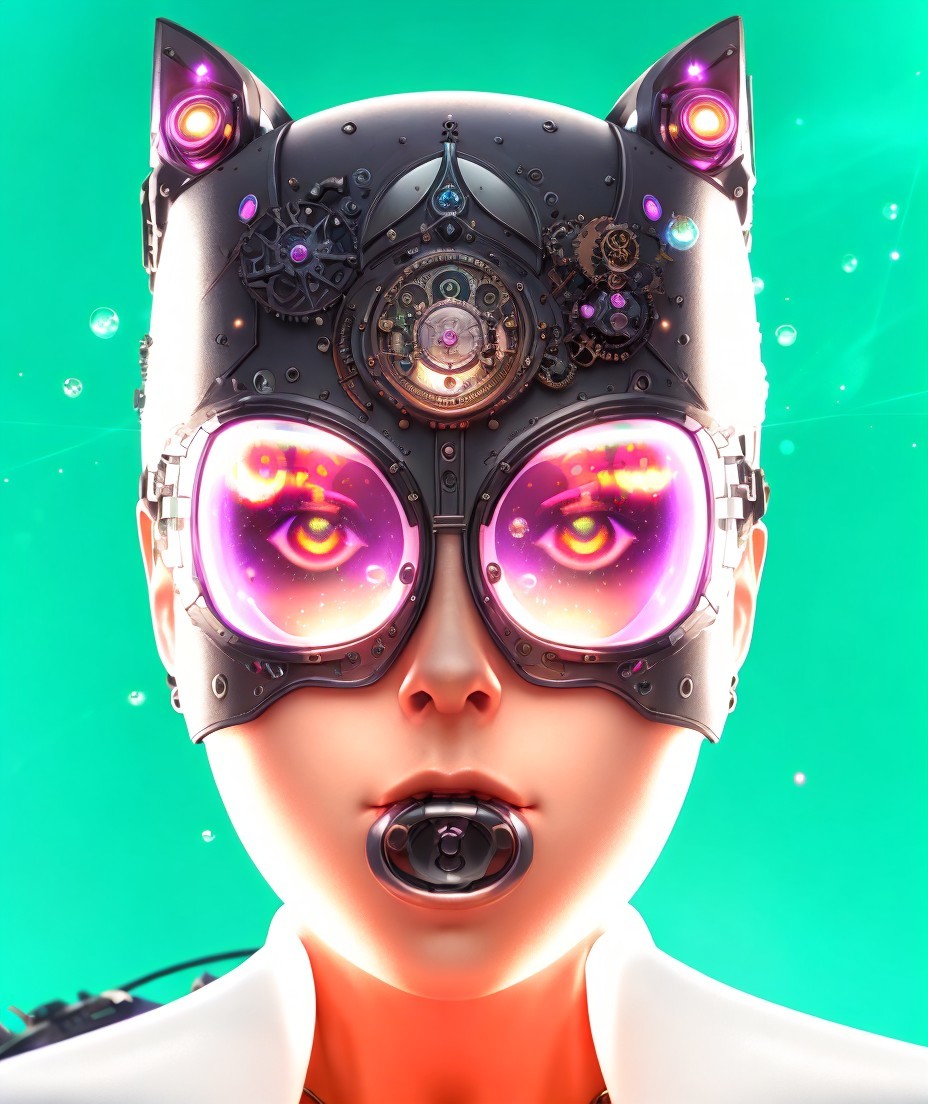 +cyberpunk, green lighting, volumetric plush, psychedelic fittings, psychpomp, burst bubbles, shiny sparks, eldritch fantasy, gothic, mechanical fittings, steampunk garments, notorious goddess, futuristic city, big lips