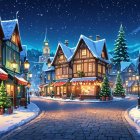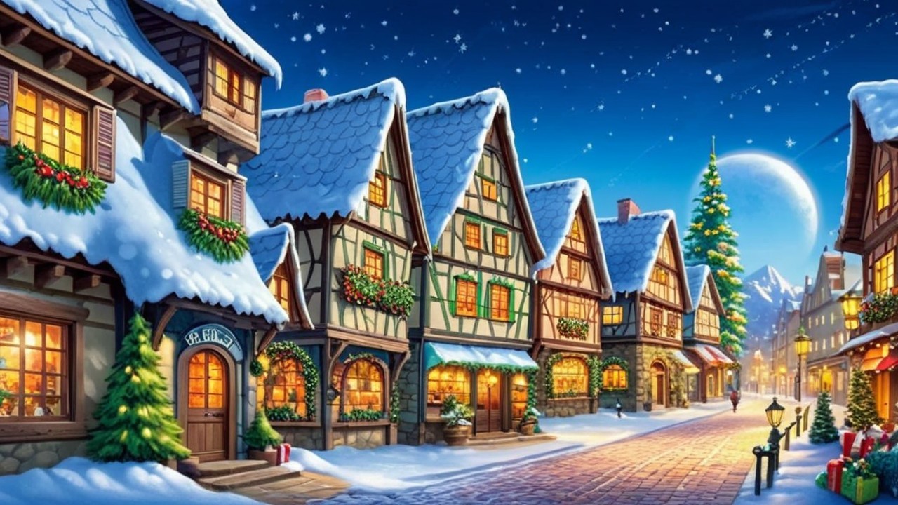 A snow covered village street at night, with half-timbered houses adorned with Christmas decorations, lit windows, snow-covered roofs, a large moon, a decorated Christmas tree, glowing streetlights, and a cobblestone street.