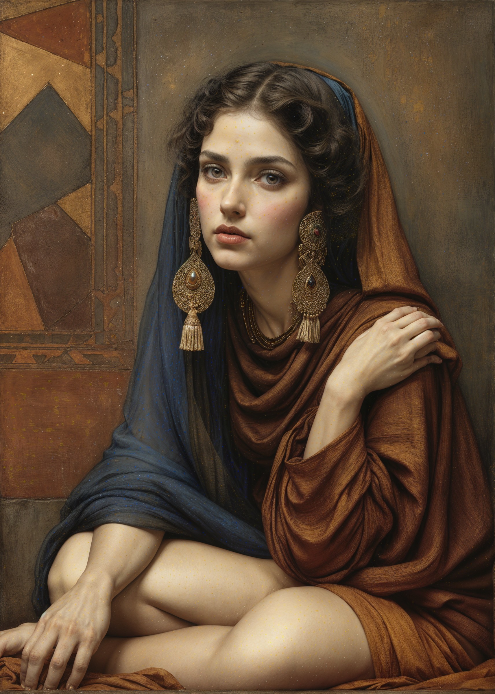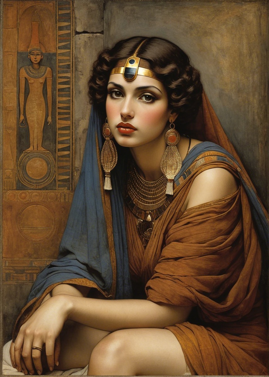 A striking portrait of a woman with long, flowing hair, adorned in intricate jewelry, including earrings and a headpiece. She wears a flowing fabric and gazes with a captivating expression.