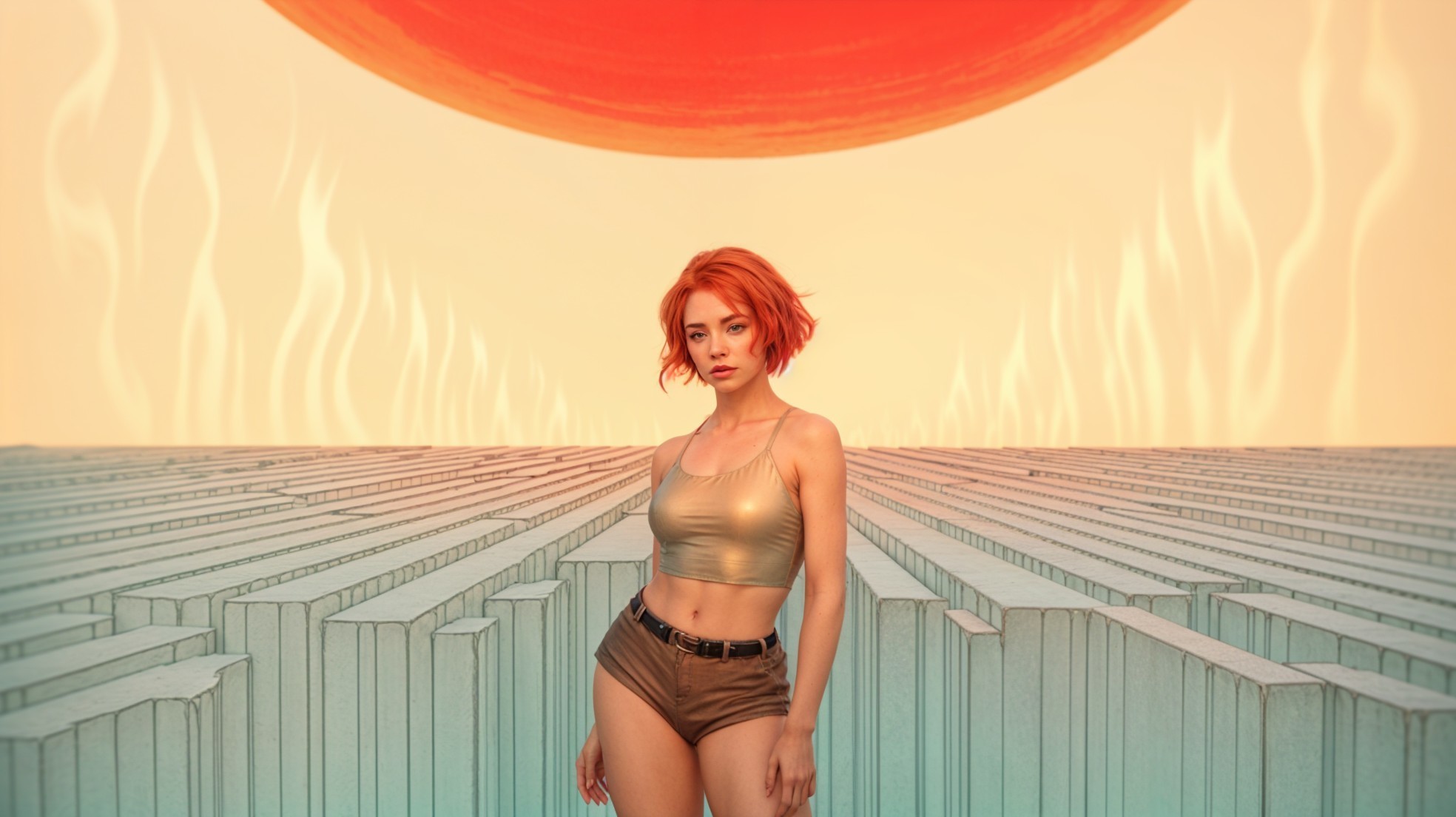 A striking scene features a woman with vibrant red hair wearing a metallic bikini, standing on a surreal landscape under a large, orange celestial body at sunset.