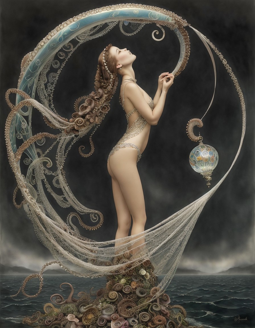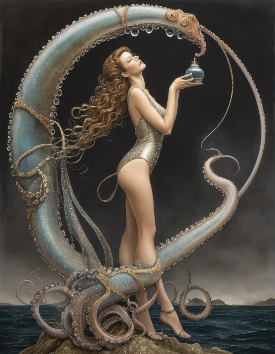 A fantasy artwork of a woman with tentacles for a lower body holding a glowing orb, with a stormy sea in the background.