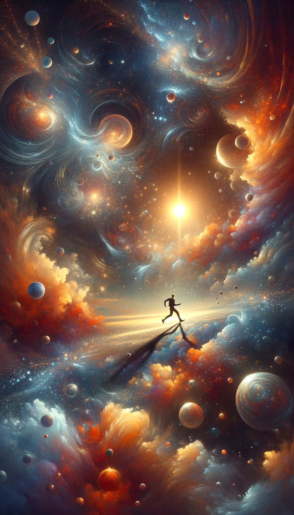 A surreal cosmic scene with a person on a rock, surrounded by vibrant galaxies, stars, and planets in a swirling, colorful nebula.