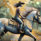 A young woman in a cowboy hat rides a white horse through a sunlit forest, surrounded by vibrant greenery and tall grass. The scene conveys freedom and connection to nature.