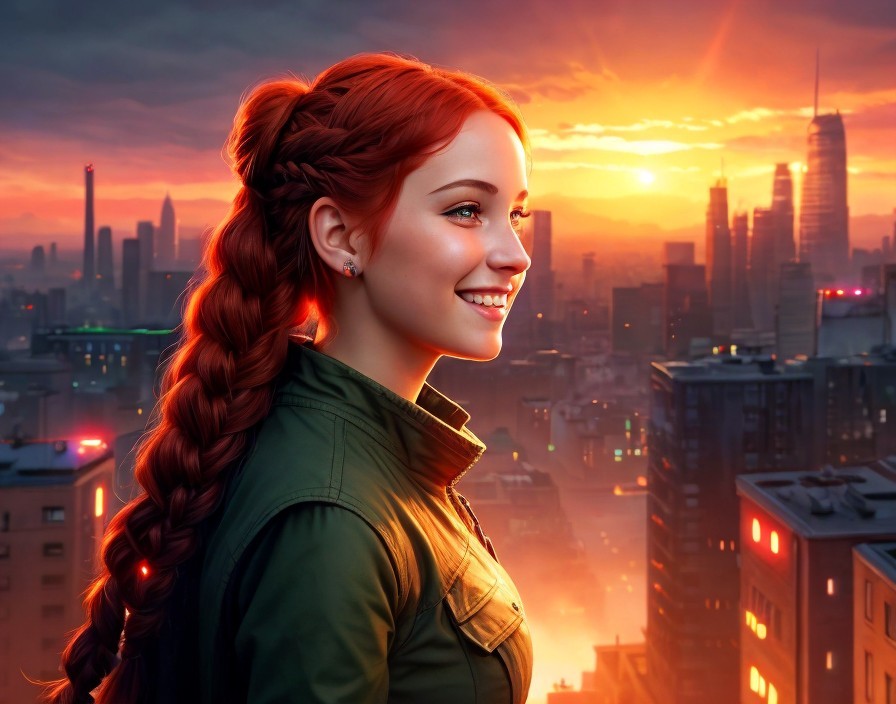 Prompt: "A young woman with red hair tied into a loose braid. She has green eyes and smiles happily.