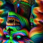 A vibrant, surreal creature with multicolored skin and exaggerated features, adorned with sparkling gems. Its fierce expression contrasts with the whimsical, psychedelic background.