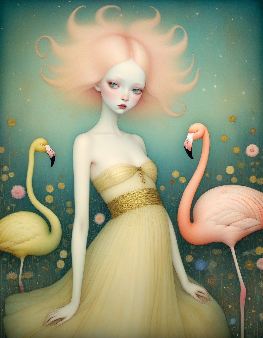 A woman with an elaborate pink hairstyle stands among flamingos, with a whimsical, dreamy backdrop and butterflies.