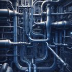 The image features a complex network of metallic pipes in various orientations, filled with glowing blue elements, creating an industrial and futuristic atmosphere.