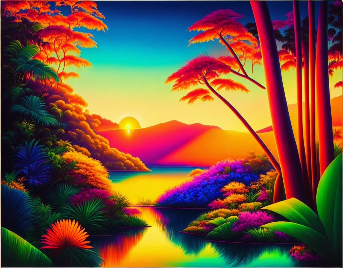 Create a vibrant and colorful tropical landscape at sunset with intense, saturated colors. The image should have a central lake reflecting the hues of the sky and the surrounding flora. At the horizon, place gently rolling hills silhouetted against a rich orange and yellow sky, with the sun hanging low near the center, casting a serene glow. Both sides of the lake are framed with lush, verdant foliage, including large, gold-veined broad leaves in the foreground and dense, flowering bushes further back.