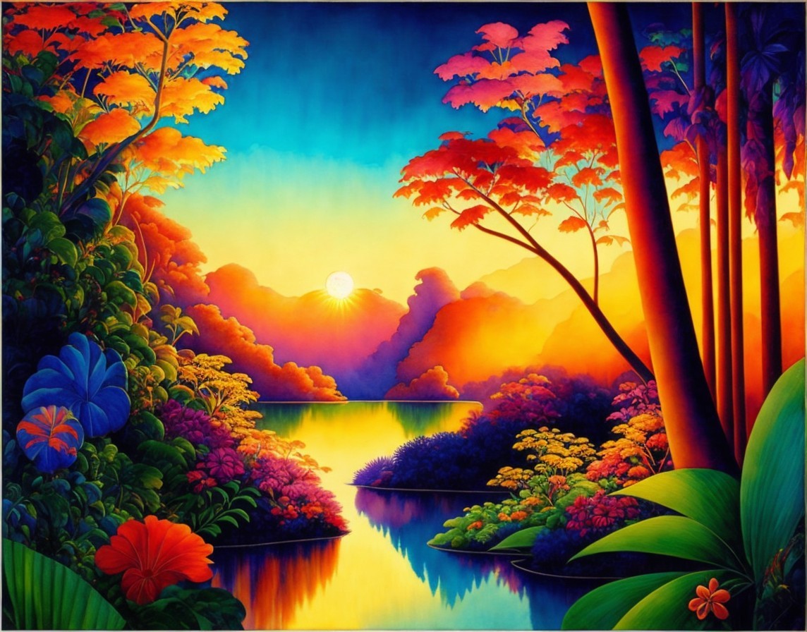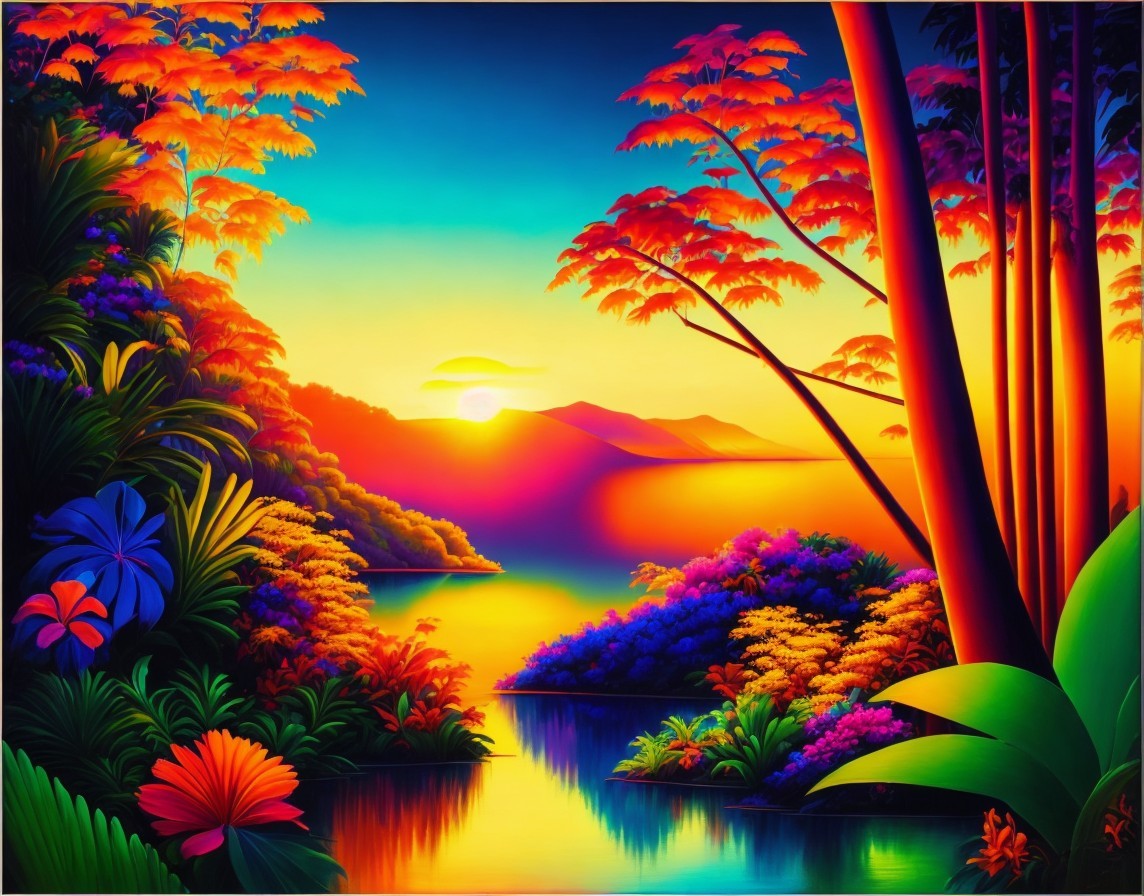 Flora along the water's edge should include tropical flowers and bushes in pink, yellow, and fiery reds, contributing to the overall warmth of the image. The water itself is calm, with a glass-like surface reflecting the vibrancy of the sky and the rich colors of the surrounding plant life. Implement gradients from deep blue-green in the upper part of the image to yellows, oranges, and pinks near the horizon and reflections. The artwork style should be reminiscent of an acrylic painting, shimmering with slightly exaggerated colors outlined in gold that convey a sense of paradise.