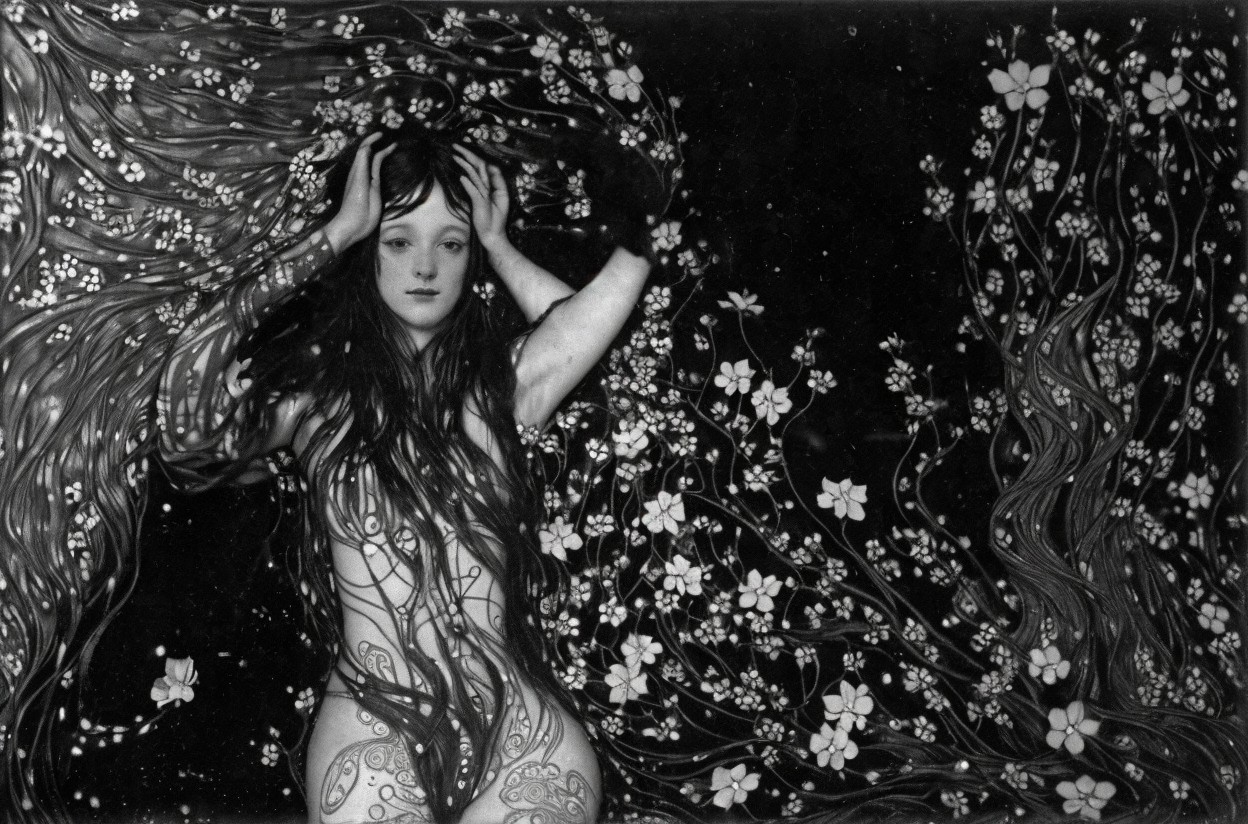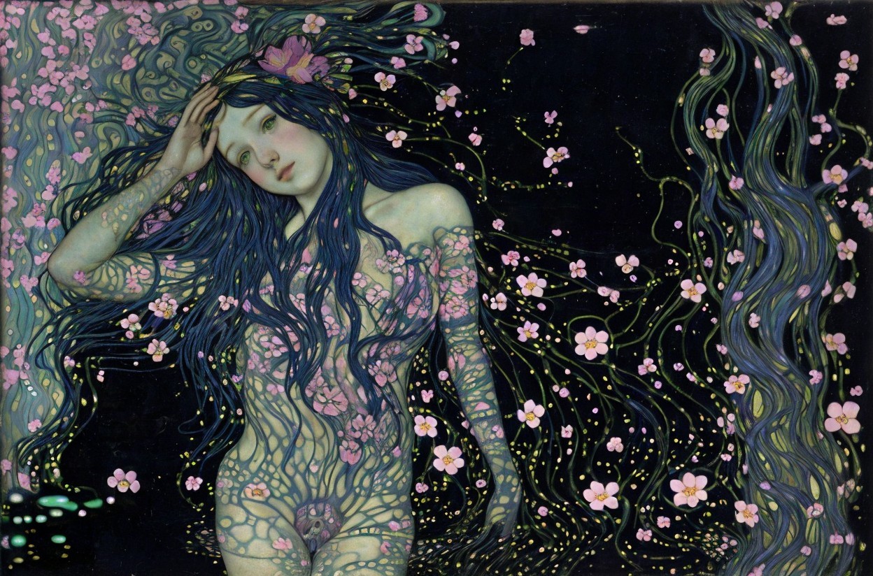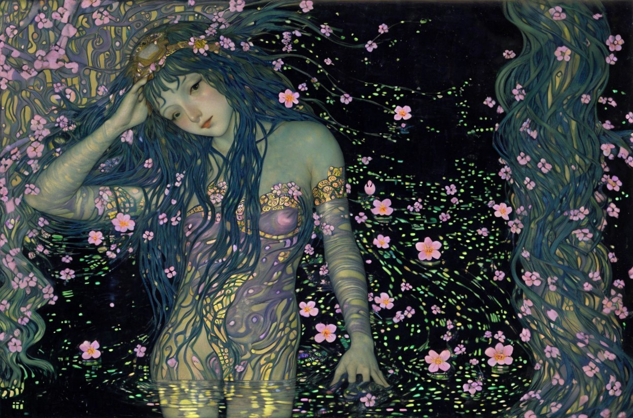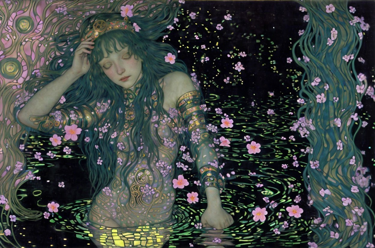 Green-haired woman submerged in water surrounded by flowers and light patterns