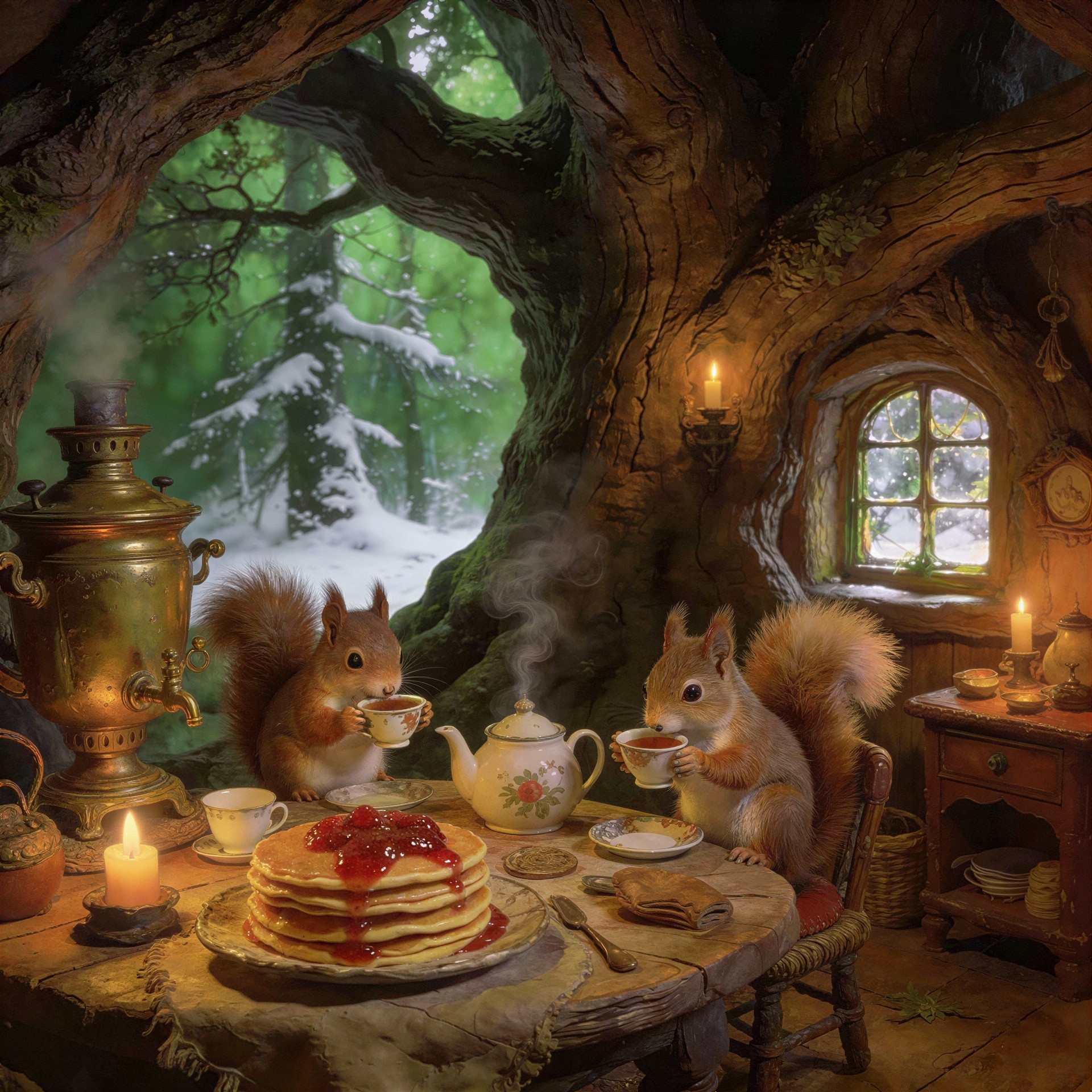 Two adorable, photorealistic squirrels are enjoying a cozy pancake and tea party inside a magical hollow tree in a snowy, enchanted forest. The interior of the tree, lit by soft candle light and a small window overlooking the snowy scene, is intricately detailed with natural wood textures and whimsical decor. One squirrel on
