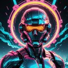 A futuristic figure in a sleek, high-tech helmet with vibrant neon accents. The background features dynamic geometric shapes and glowing elements, creating a sci-fi atmosphere.